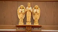 The two adoring angels at the top of the reredos, on either side, recall the Ascension. Just beneath each angel, are the carvings of Moses and Elijah, who appeared with Christ at the Transfiguration. While the statues of Moses and Elijah were done by a local artist, the Evangelist statues came from Italy, and the adoring angels from Spain.