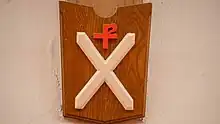 The first shield we will examine is found as you first enter the nave looking up at the trusses on the left side. We will then work our way forward from the choir loft towards the pulpit area. The first shield depicts Two Keys and represents Simon Peter, Andrew's Brother, called Peter by Jesus of Nazareth. Traditionally, St. Peter is represented holding Two Keys of equal size, which is explained by the Savior in the Gospel of Matthew: “And I will give unto thee the keys of the kingdom of heaven: and whatsoever thou shalt bind on earth shall be bound in heaven: and whatsoever thou shalt loose on earth shall be loosed in heaven” (Matthew 16:19).
