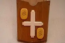 Our next shield depicts a Cross and Two Loaves which represents Philip, from Bethsaida of Galilee. He preached in Greece, Syria, and Phrygia. Traditional symbols assigned to St. Philip include: the cross with the two loaves because of his answer to the Lord in John 6:7. St. Philip was present at the feeding of the five thousand. To test him, Jesus asked St. Philip, "Where are we to buy bread for these people to eat?" St. Philip replied, "Two hundred denarii would not buy enough bread for each of them to get a little". Yet Jesus did not rebuke him for his lack of faith.