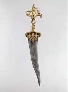 Zoomorphism appears on objects beyond household items. An example of this is the Dagger with Zoomorphic Hilt also located at the Metropolitan Museum of Art in New York. The hilt or handle of the dagger merges into the shape of a dragon attacking a lion who is performing the same act onto a deer. Each attacking animal is connected by its claws and teeth to form the handle. The inclusion of Persian and Indian symbols of power was common in zoomorphic imagery on hilts of daggers.[15] In this dagger there is a figure of a bird in front of the deer who is meant to represent the Indian deity Garuda.[16] Due to the intricate design and craftsmanship of this dagger, it would most likely not have been used for the purposes of a weapon, but rather as a ceremonial object.[17] Many of the weapons included in Islamic art served as symbols for power and wealth.[18]